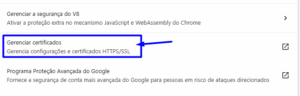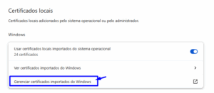 Clique em “Gerenciar certificados” e depois em “Gerenciar certificados importados do Windows”.