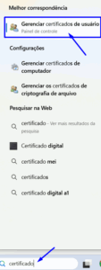 No campo de pesquisa do Windows, pesquise por “Gerenciador de Certificados”, clique para abrir a janela, conforme imagem abaixo.