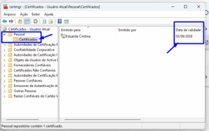 Depois disso, uma janela do Gerenciador de Certificados será aberta. Clique na pasta “Pessoal” e depois em “Certificados”. Assim, seus certificados instalados serão exibidos e você poderá verificar a data de validade na coluna correspondente.